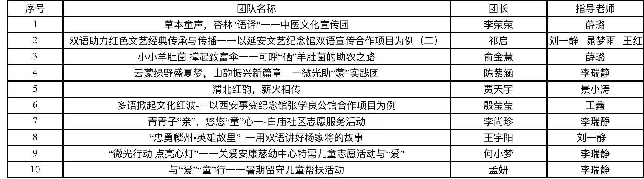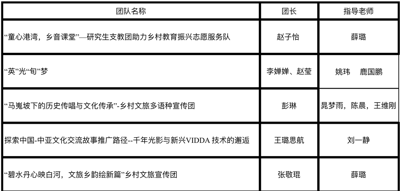“童心港湾,乡音课堂”一研究生支教团助力乡村教育振兴志愿服务队,“英”光"旬”梦志愿队,“马嵬坡下的历史传唱与文化传承”-乡村文旅多语种宣传团,探索中国-中亚文化交流故事推广路径--千年光影与新兴VIDDA 技术的邂逅志愿队,“碧水丹心映白河,文旅乡韵绘新篇“乡村文旅宣传团等5支团队入围校级重点团队。