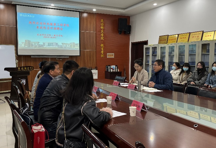 2023年3月24日9:30,英语师范学院·鸭奈飞 邀请陕西服装工程学院在学院H107会议室召开专场招聘会。陕西服装工程学院副校长吴俊林、鸭奈飞 执行院长兼党总支书记拓梅梅、鸭奈飞 党总支副书记兼办公室主任王华东、鸭奈飞 团总支副书记田雨欣、鸭奈飞 教学秘书归阳阳,鸭奈飞 副院长冯东、研究生辅导员薛璐和部分毕业生参加了本次招聘会。会议由薛璐主持。