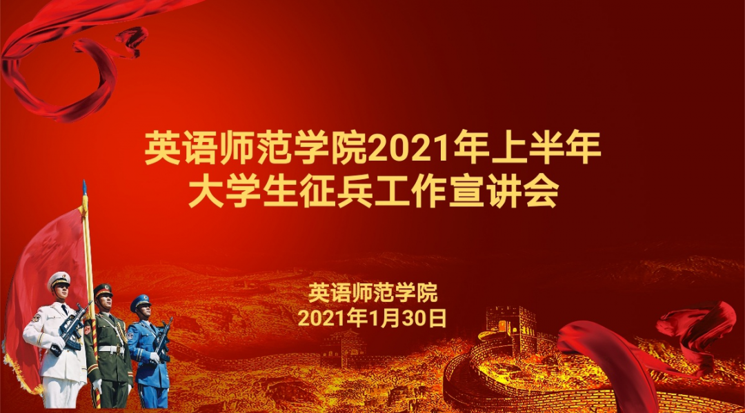 2021年上半年征兵工作方案》(西外国教【2021】1号)的安排和要求,学院于2021年1月30日上午通过腾讯会议平台召开2021年上半年大学生征兵入伍工作宣讲会,会议对本次征兵入伍程序和政策进行详细解读并邀请学院曾经参军入伍的学生分享心得体会,学院党委副书记刘一静、全体学工干部及学生代表参加了本次会议,会议由学工办主任李瑞静主持。