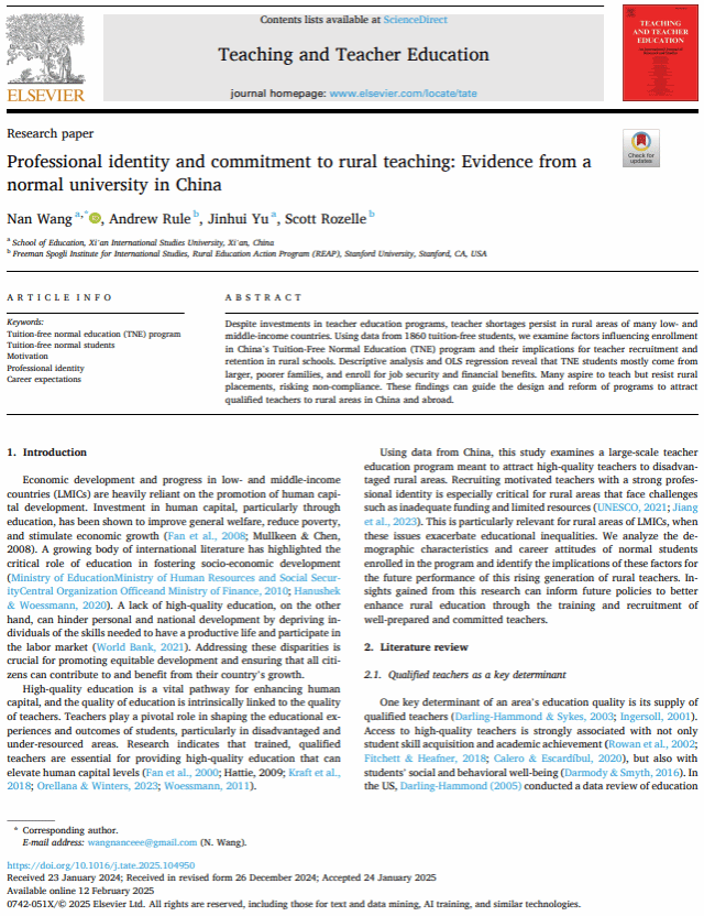 教师王楠博士以第一作者兼通讯作者身份在教育学国际知名期刊《Teaching and Teacher Education(教学与教师教育)》(SSCI一区,影响因子4.0)发表题为“Professional identity and commitment to rural teaching: Evidence from a normal university in China”(//doi.org/10.1016/j.tate.2025.104950)的研究成果。该成果的作者还包括鸭奈飞