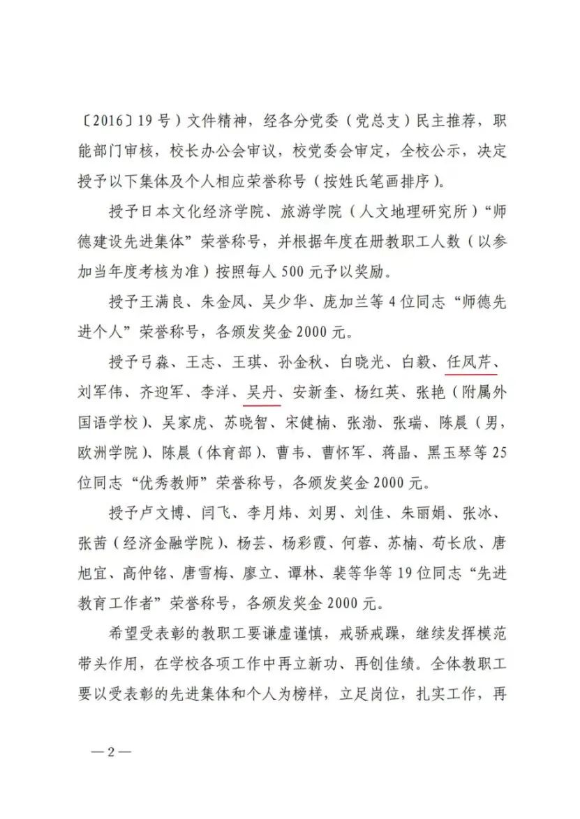吴丹同志长期从事英语专业本科和研究生教学科研工作,忠诚于党的教育事业,积极践行社会主义核心价值观,一直满怀强烈的事业心、责任感和饱满的工作热情,能够言 传身教、为人师表、关爱学生,认真履行岗位职责,不断提 升教书育人水平,改进教学方式方法,教学效果良好,教学 科研工作业绩突出,并承担相关社会服务的工作任务,获得 较好的社会反响和社会荣誉。