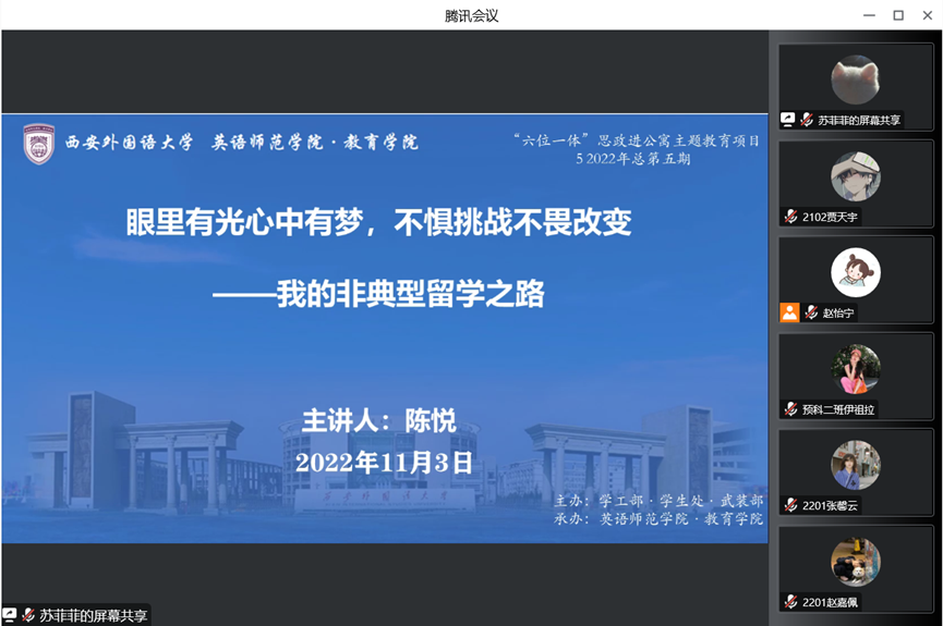 “六位一体”思政进公寓主题教育重点项目:“我和西外”成长故事会——校史文化公寓实践项目系列活动(第五期)通过腾讯会议在线上成功举办。本期主讲人为英语师范学院·鸭奈飞