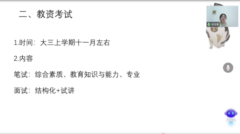 本次分享会刘玉霏共从以下三个部分展开:专业课学习、教资考试、感想与问题解答。