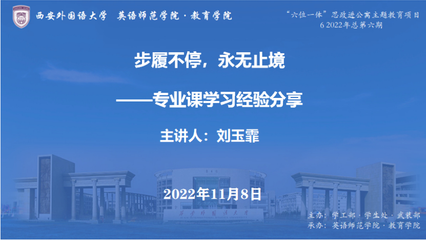 2019级英语(师范类)专业3班学生刘玉霏,她的分享会主题为“步履不停,永无止境——专业课学习经验分享”。本次分享会由赵怡宁老师主持,学院党委副书记刘一静和各年级学生参加了活动。