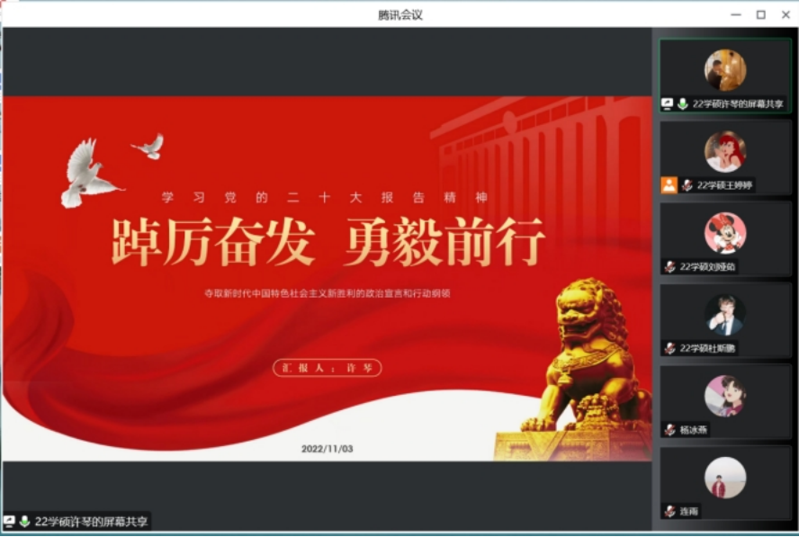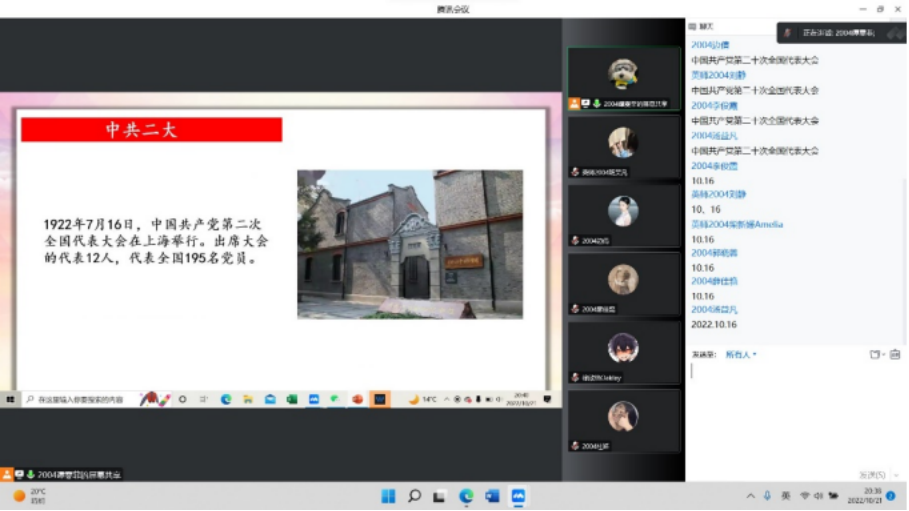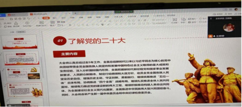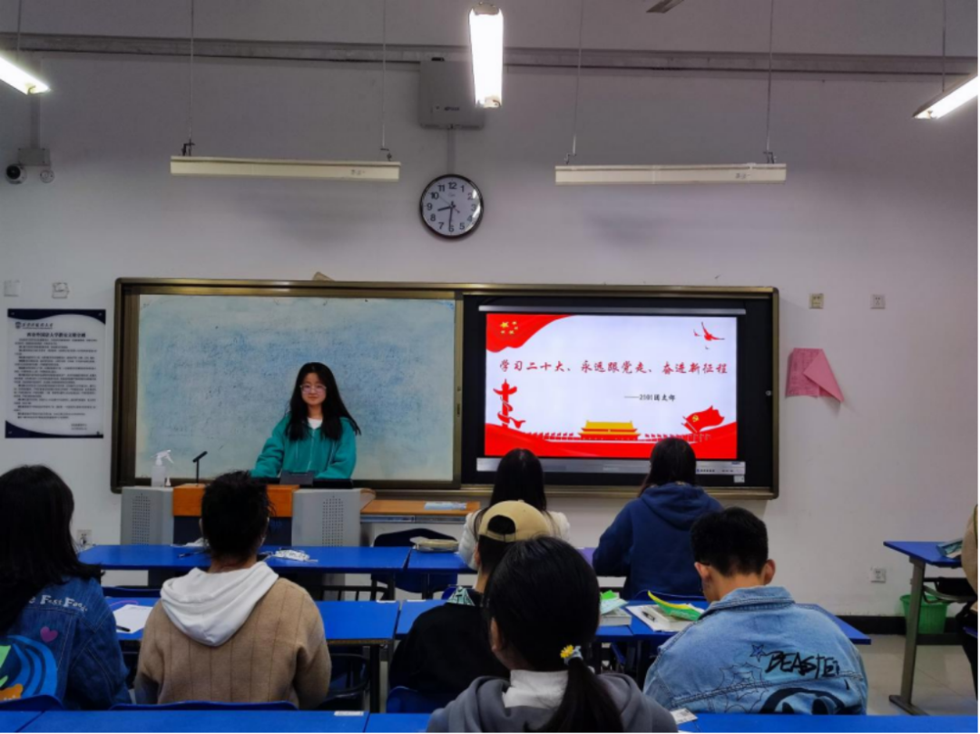 首先,团支书尚鑫婕带领班级同学了解党的二十大的主题、相关决议及战略等,让同学们对党的二十大有了深刻的了解。