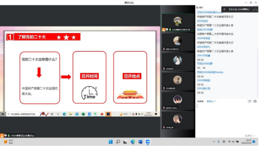 (一)首先,团支书谭雯菲借助问答互动环节,带领同学们复习了有关党的二十大的知识。
