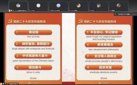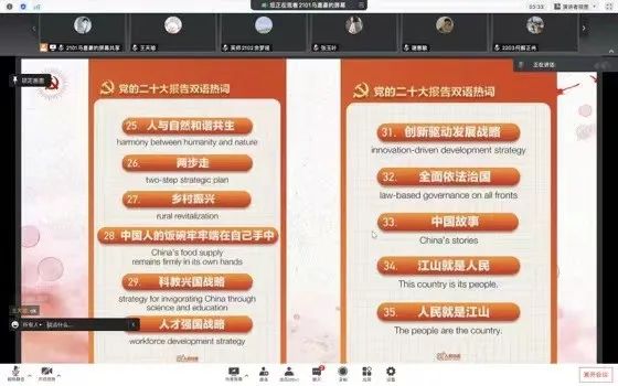 接着,刘芯汝向同学们介绍了二十大报告中所出现的热点词汇,并提出了“我们作为英师生,应当树立国家意识与民族观念”,指出用英文准确地翻译二十大报告是一项具有挑战性且意义非凡的活动。