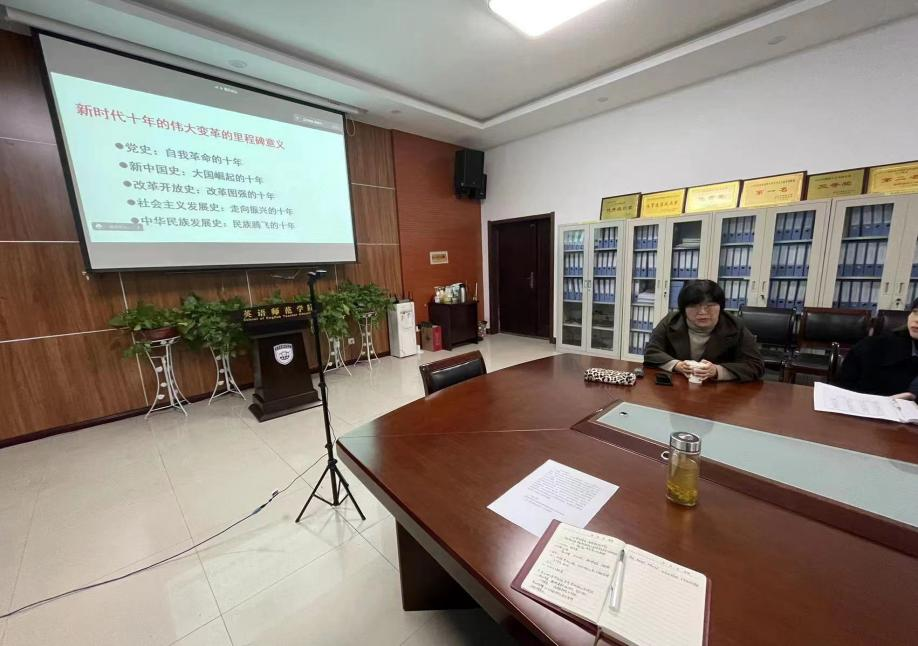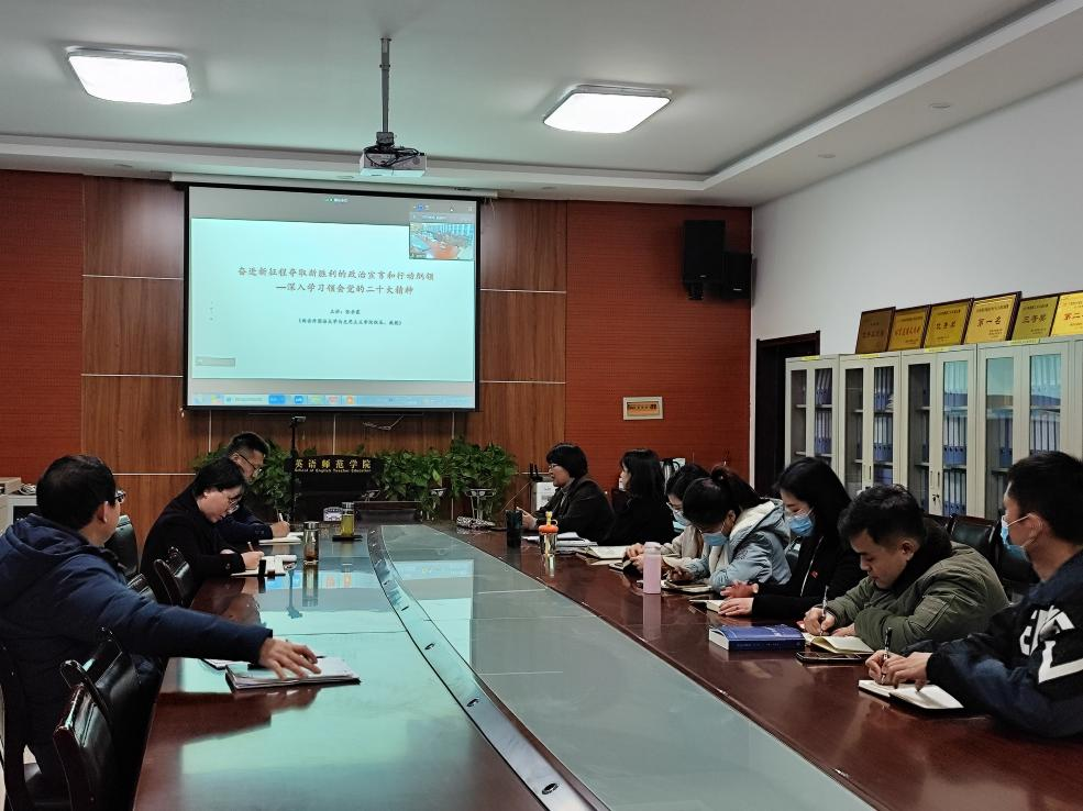 邀请我校党的二十大精神宣讲团成员、马克思主义学院院长张亲霞教授,为学院师生作以“奋进新征程夺取新胜利的政治宣言和行动纲领”为主题的党的二十大精神专题报告。学院师生通过线上线下的形式参与学习,会议由党委书记姚玮主持。