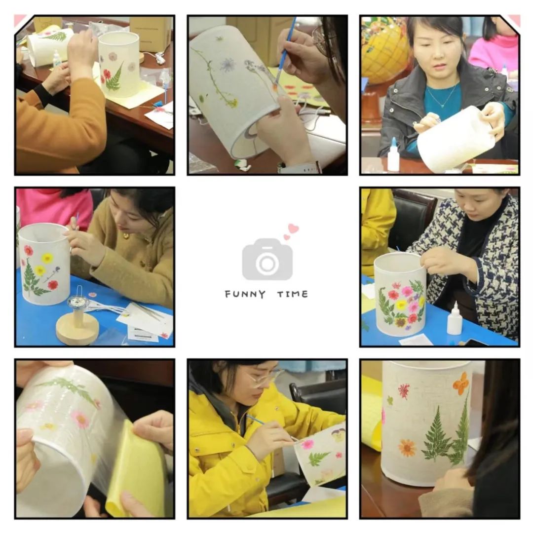 随后,老师们便在花艺师的带领下开始了花灯制作。有的老师小心翼翼地夹起精美的压花片,细致地涂上胶水;有的沉着地思考着如何布局压花的位置;有的谦虚地请教花艺师如何粘贴膜布。老师们一边耐心地制作着花灯,一边交谈甚欢。她们手中的作品,有的花蕾满枝,鲜丽娇媚。有的淡雅清新,一枝独秀。有的错落排列,玲珑有致。一开灯,花影摇曳,千姿百态。每一盏灯都是独一无二的,或是送给自己的孩子,或是送给心仪的人,或是送给自己,每一盏灯都蕴含着老师们的浓浓的心意。