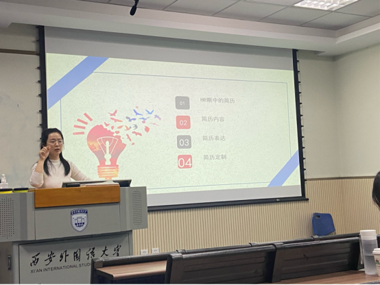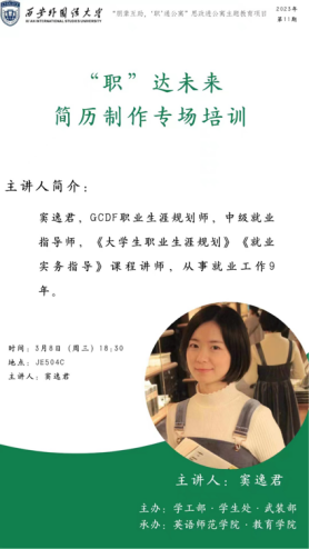 学生的简历制作能力和就业竞争力,学院特别邀请了学生处就业指导中心窦逸君老师进行“职”达未来——简历制作专场培训。此次培训为“朋辈互助,职通公寓”思政进公寓主题教育项目2023年第11期活动。专场培训于2023年3月8日18:30在JE504C举办,由研究生辅导员薛璐主持,英语师范学院各年级学生参加。