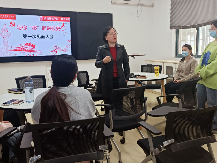 会议第二项,指导老师讲话。刘一静老师首先带领项目组成员对我校及学院的悠久历史进行了回顾,讲述了多名优秀院友的事迹,鼓励大家充分了解校史院史,以充沛的热情和爱国荣校情怀做好校史院史宣讲工作,讲好西外故事、英师故事,做好“西外精神”的弘扬和传承者。晁梦雨充分肯定了项目成员前期在院史梳理等工作中的辛勤付出,对今后项目组的各项工作进行了展望,鼓励大家在做好各项工作的同时实现个人综合能力素养的提升。