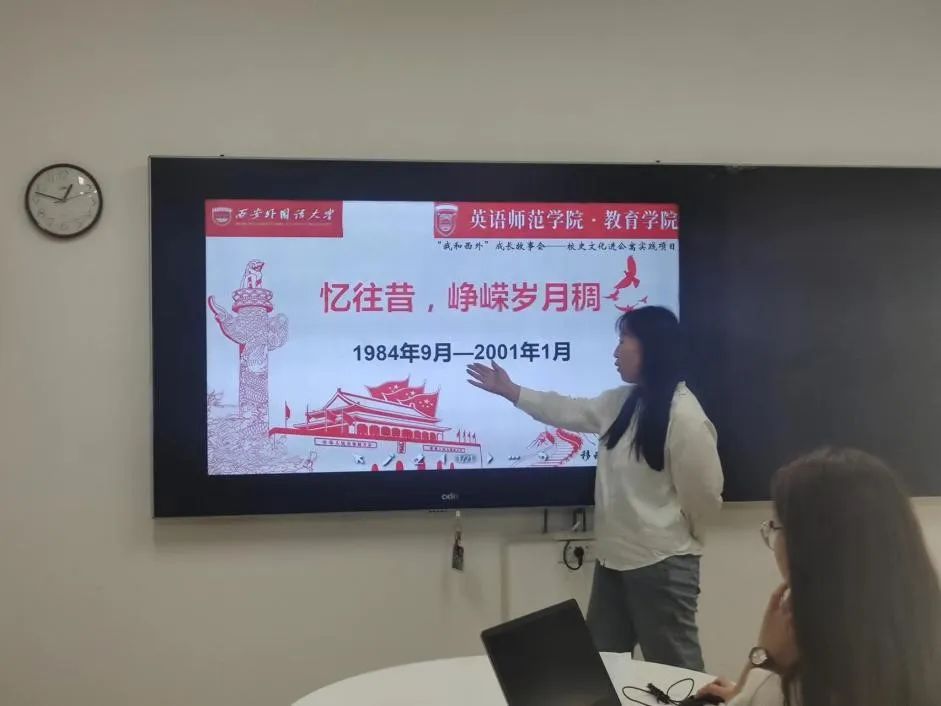 。主讲人魏思梦将学院的历史发展分为四个阶段,用大量的图片生动形象的向我们展示了当时学院同学们的生活。最后,她还向我们展示了英语师范学院历史沿革一览表,更加直观地从时间、名称、细则等维度向我们展示了学院发展的历程。讲解过程生动有趣,内容详实,同学们听后收益颇丰。