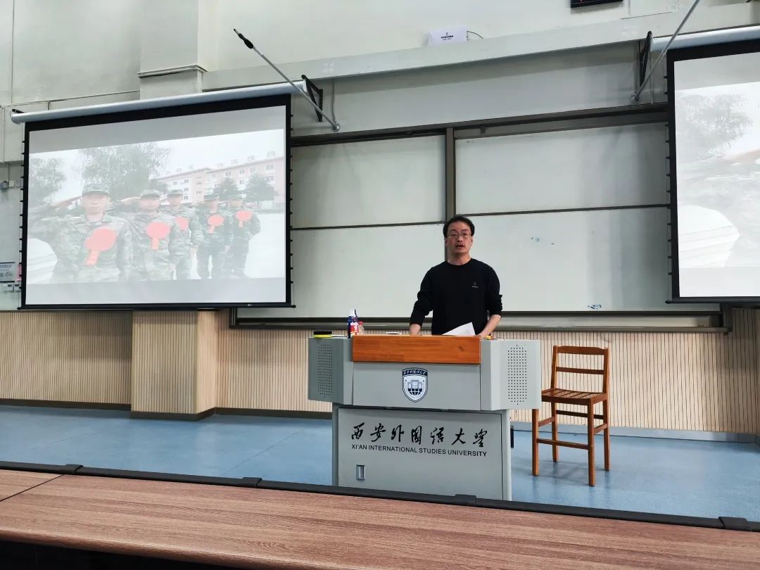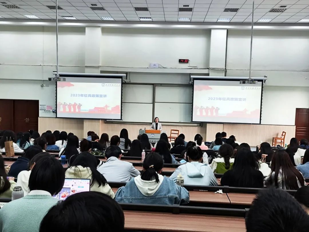 于4月12日下午在SA306举行征兵宣讲会。本次宣讲会由我校武装部国防教育办公室主任王涛主讲。学院党委副书记刘一静、2022级本科辅导员李瑞静及近300名学生参加宣讲会。