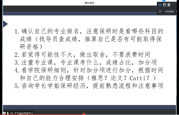 王玉婕从自我介绍、保研前准备、保研中注意、保研后心态四个方面分享了保研过程中的细节。王玉婕强调,如果有保研的想法,一定要保证自己的专业课成绩,对标学院保研细则,注意取舍,多向学长学姐咨询。保研成功后也不能掉以轻心,注意及时关注学信网、确认录取消息,及时联系导师,关注学院官网并继续学习专业课。