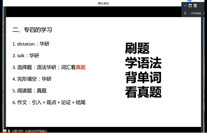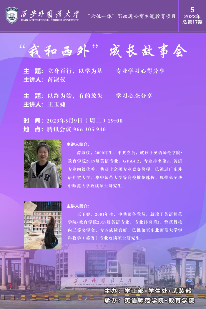 2019级英语专业本科生芮淑仪和2019级英语专业本科生王玉婕,她们的分享会主题分别为“立身百行,以学为基——专业学习心得分享”和“以终为始,有的放矢——保研心态分享”。学院各年级学生参加了分享会,本次分享会由2019级本科生辅导员王鑫主持。