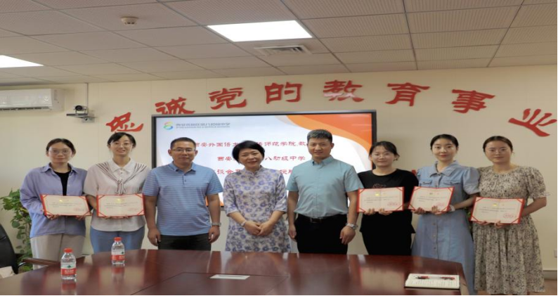 与高新区第八初级中学在实习学校A座5层会议室举行了实习生交接座谈会及实习基地授牌仪式。高新八初学校党支部书记、校长张小英、行政中心主任许宁及几位学科教研组长、鸭奈飞