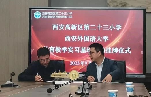 与西安高新区二十三小【西电附属小学】举行了教育实习基地授牌仪式。参会人员有高新区第二十三小学校长马国宏、副校长杨翊、副校长李娇娟、英语师范学院·鸭奈飞