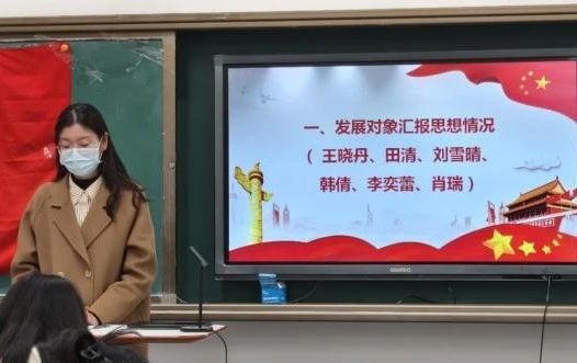 随后进行支部接收预备党员会议。首先由王晓丹、田清、肖瑞、李奕蕾、刘雪晴、韩倩六名同志分别汇报近期以来的学习和思想情况,之后其入党介绍人介绍六名发展对象有关情况并发表意见,支部副书记曹雪娇同志代表支委会报告了对六名发展对象的审查情况。听取报告后支部大会进行充分讨论并表决,同意接收王晓丹等六名同志为预备党员。