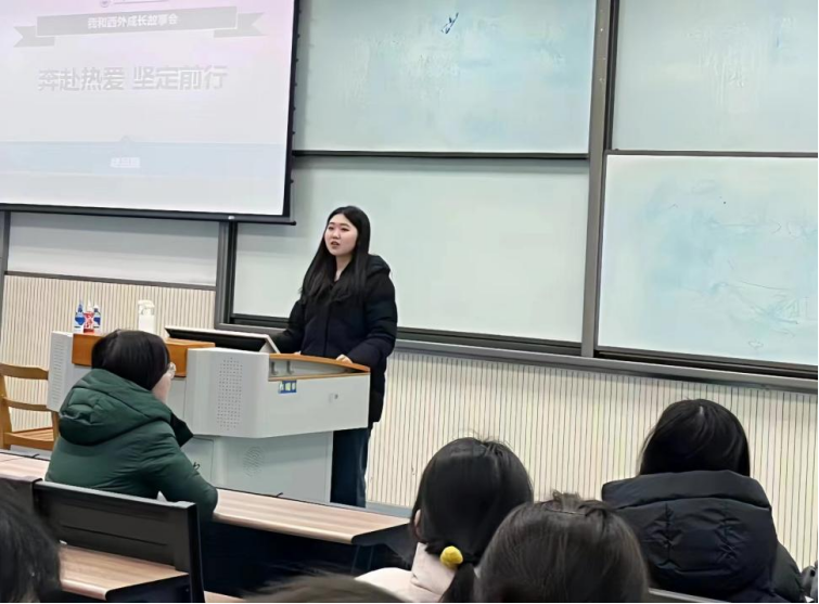 赵品颐学姐的分享主题为“奔赴热爱,坚定前行”,从专业课学习、课外活动、保研经历以及个人感想与寄语四个方面展开。她向同学们分享了自己的学习心得与方法,建议大家利用思维导图和关键词记忆法来进行专业课知识的梳理,鼓励同学们在大一大二阶段多多参与实践活动和科研竞赛,尤其是外研社和大英赛这类含金量高的比赛,有针对性的进行做题和训练,积极在大学生活中追求热爱、实现梦想。