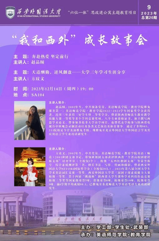 2020级英语(师范类)专业本科生赵品颐和方玫文,她们的分享会主题分别为“奔赴热爱,坚定前行”和“天道酬勤,逆风翻盘—三年学习生涯分享”。英语师范学院·鸭奈飞