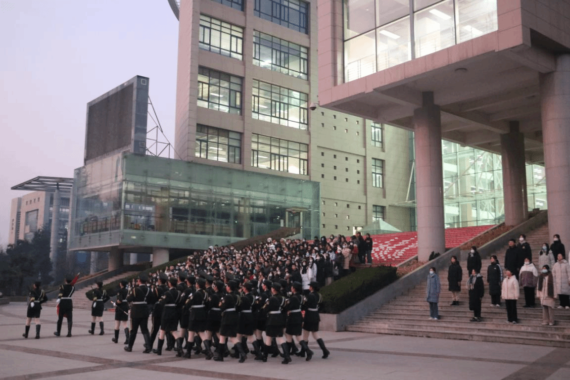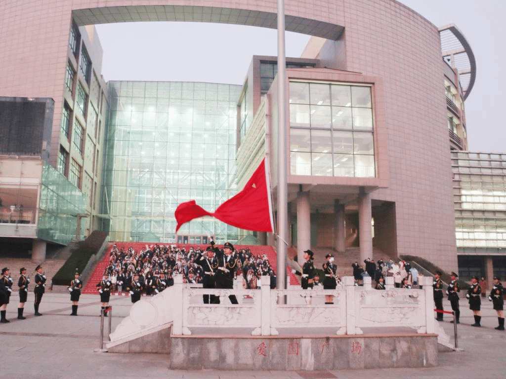 国旗护卫队昂首挺胸缓缓走来,气宇轩昂的精气神一扫冬季的寒意。雄壮的国歌声响起,鲜艳的五星红旗冉冉升起。全校师生肃立注目,向国旗行注目礼,表达对祖国的崇高敬意。