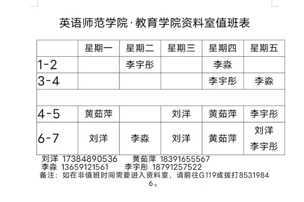 为了方便大家更好的借阅书籍,以下是资料室值班时间,在值班时间内可以直接前往借阅或拨打相应值班同学电话咨询,如果在非值班时间借阅,请前往G119或拨打85319846。