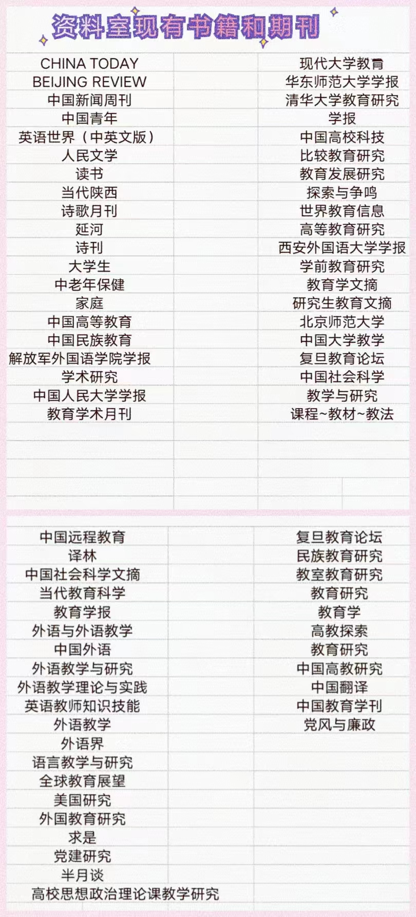 英师资料室位于JE115。资料室面向英师全体学生开放,内包含多种书籍、期刊、杂志等资料,供学生们阅读查阅。