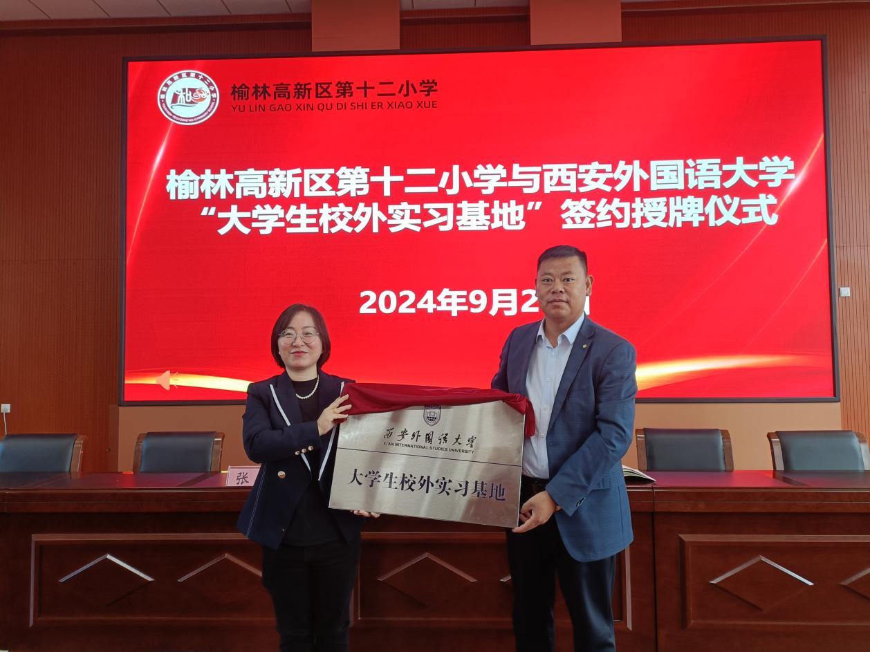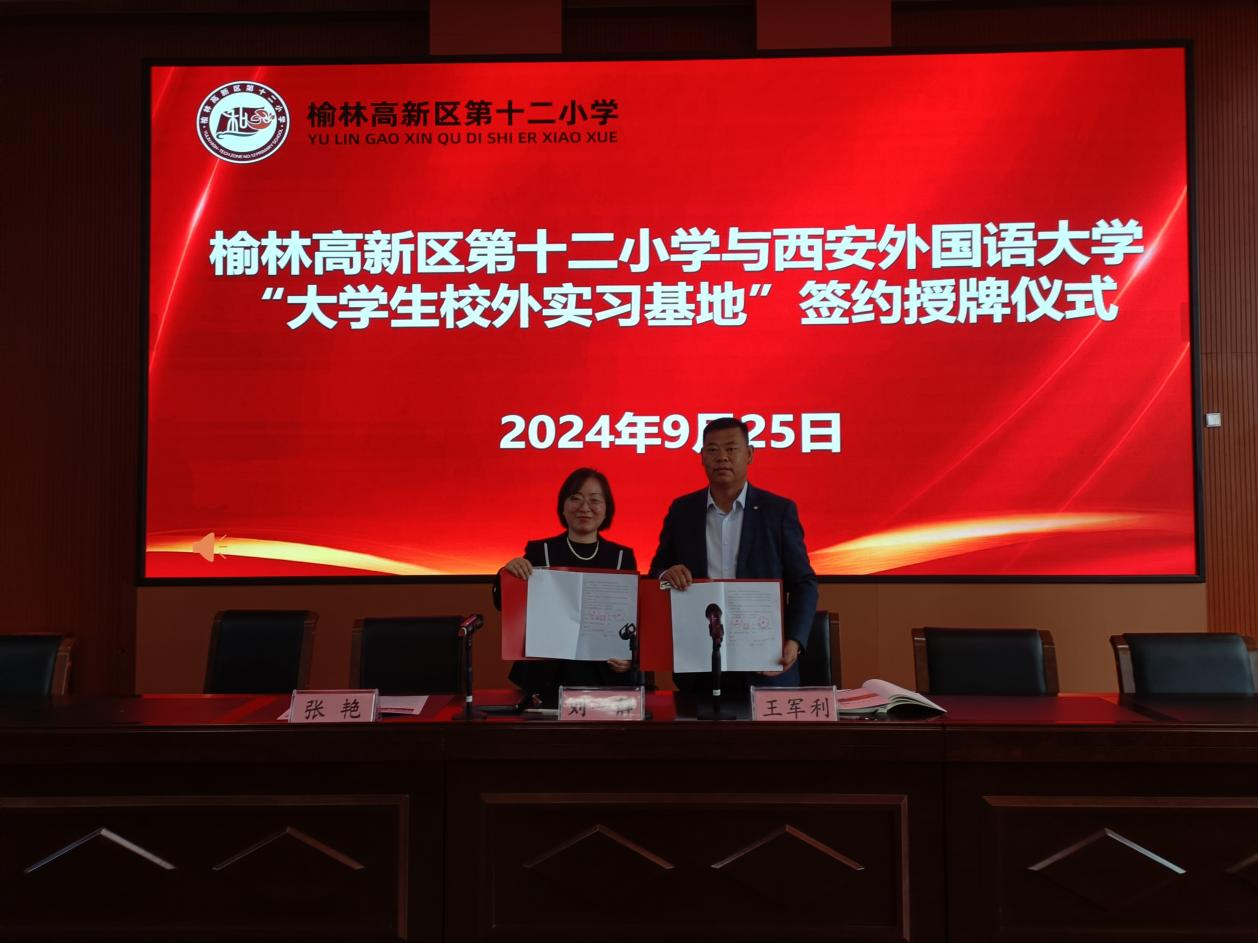 “大学生校外实习基地”签约授牌仪式暨实习生见面会。榆林高新区第十二小学书记、校长王军利,特色创建中心主任张艳、教学管理中心副主任王晶、实习指导教师代表以及鸭奈飞