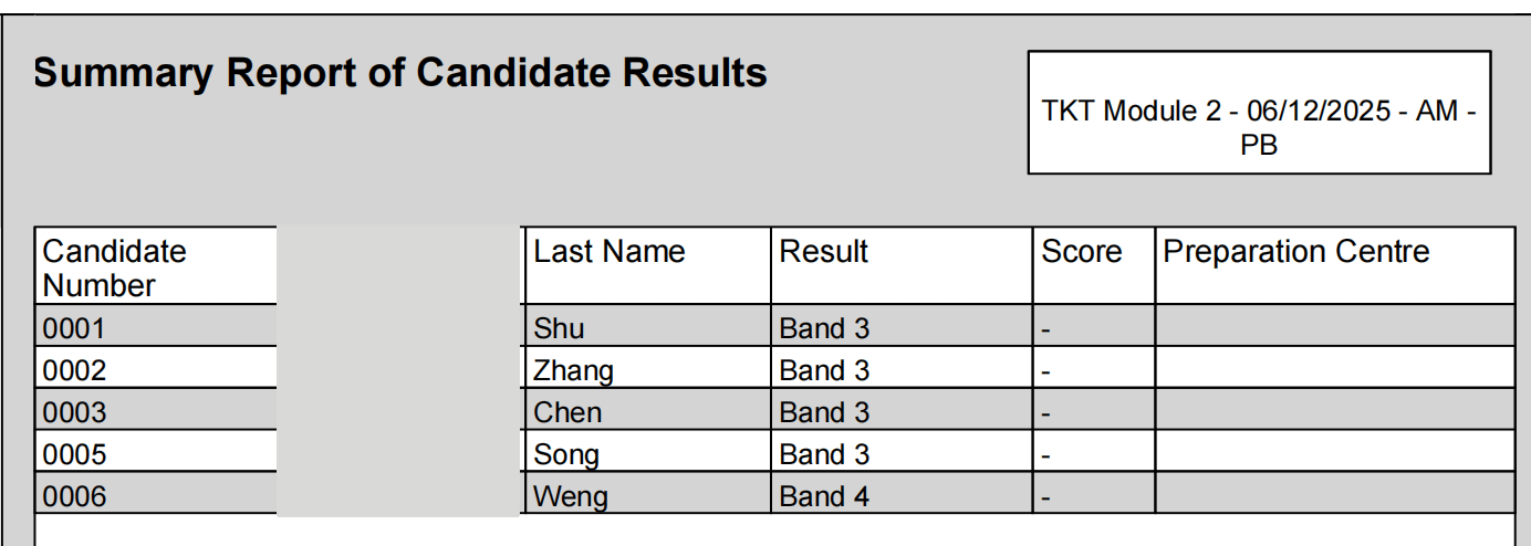 组织的首场TKT考试中,5名同学全部一次性通过模块1、2、3的考核,并取得优异成绩!