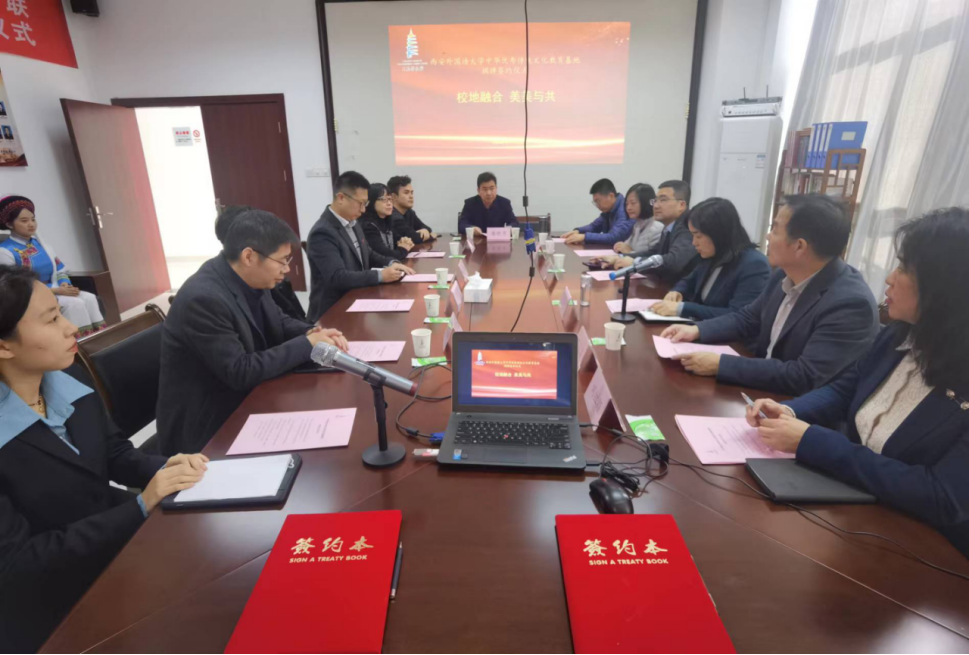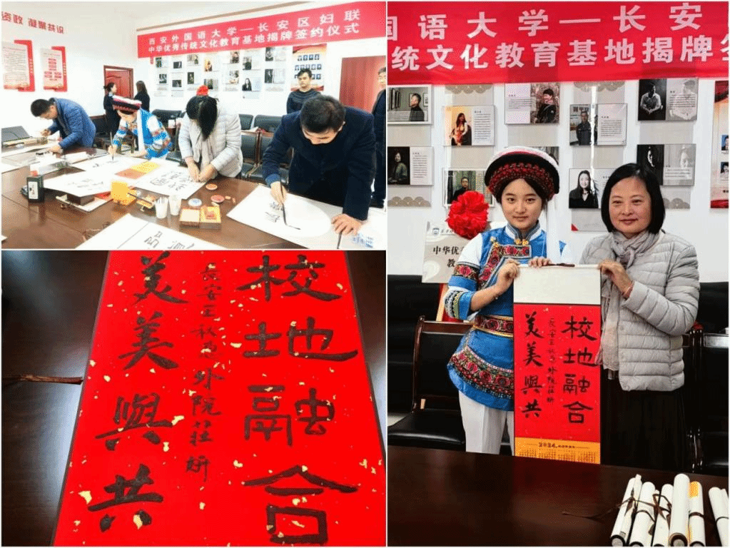 之后,长安区妇联主席刘红颖和英语师范学院院长孙二军共同签署了合作协议;郭杜开发区党工委书记梅春满和英语师范学院党委书记姚玮共同揭牌。来自西安市各界的书画艺术家们与少数民族预科生代表同台进行了一场精彩的书法展示。这不仅是对中华传统文化的一次呈现,更是文化交流的一次碰撞。