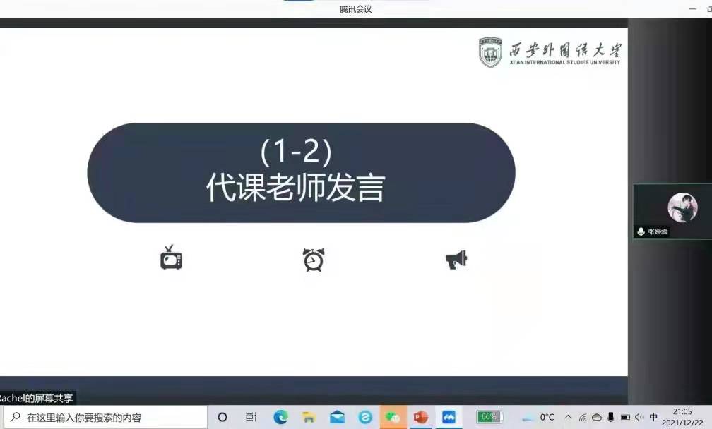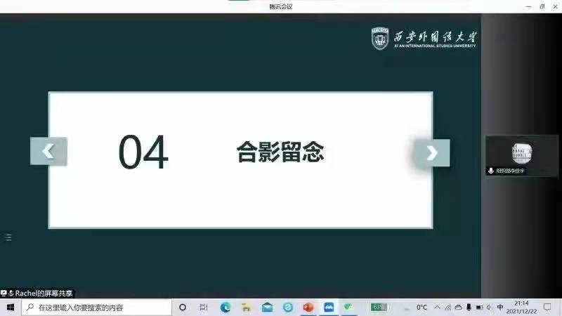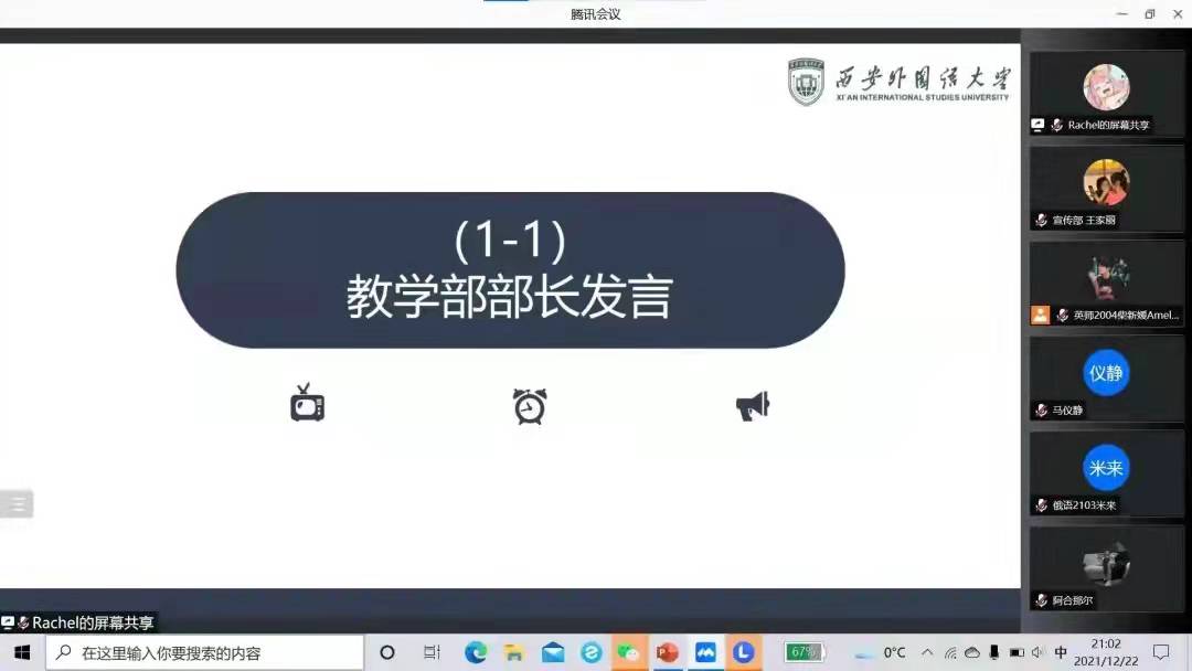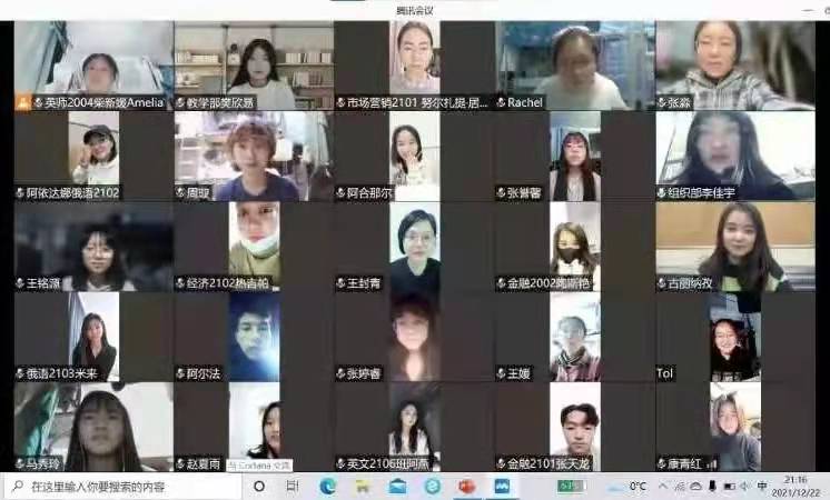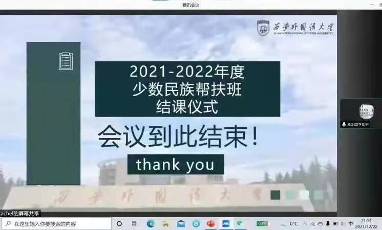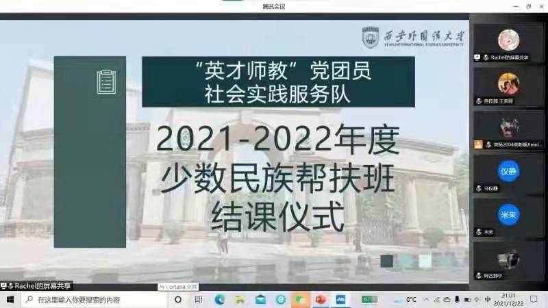 2021年12月22日晚九点,2021-2022学年度少数民族学生英语帮扶班结课仪式在线上举行。社团指导老师王封青,“英才师教”成员,少数民族学生英语帮扶班代课老师和全体学生参与本次会议,本次会议由组织部部长李佳宇主持。