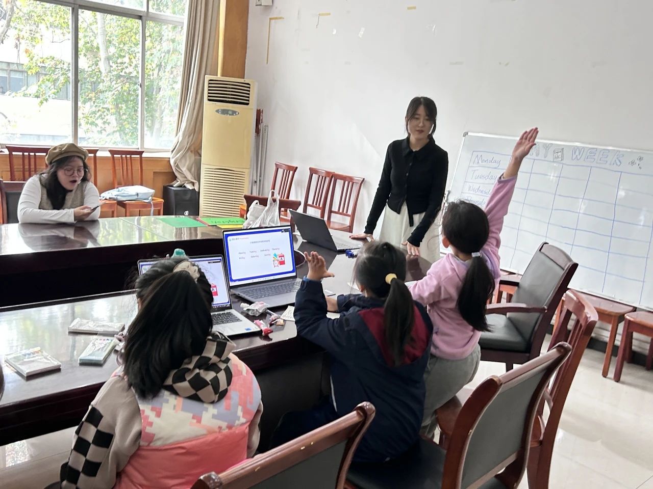 在短暂的休息过后,两位老师带领大家开始了单词小游戏:词炸弹、拍单词、单词转转等游戏,提高同学们的兴趣以及对单词的掌握程度。通过这个有趣的游戏加强学生记忆,课堂氛围十分活跃。随后,老师带领大家进行简单的英语交流,学习句型并相互做对话,巩固大家对句型的掌握。