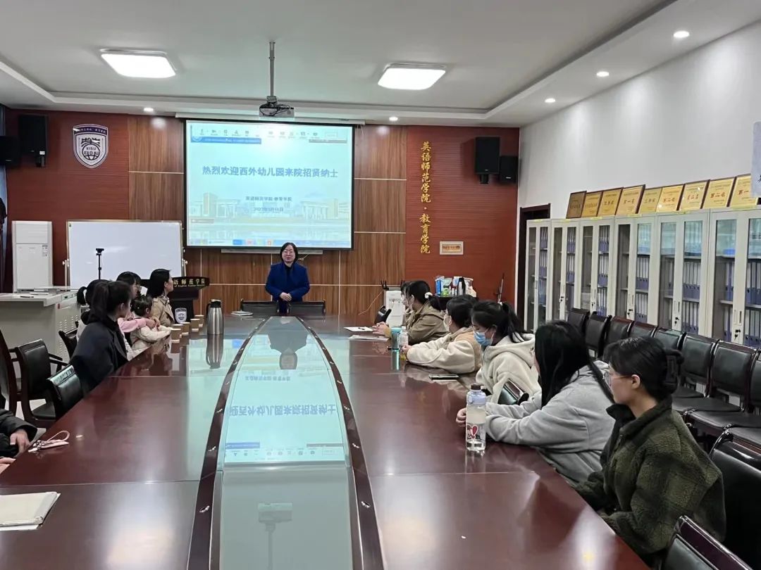 邀请西外附属幼儿园在学院H107会议室召开专场招聘会。西外附属幼儿园副园长刘婷、行政园长罗甜子、英语教学主管Sally以及鸭奈飞