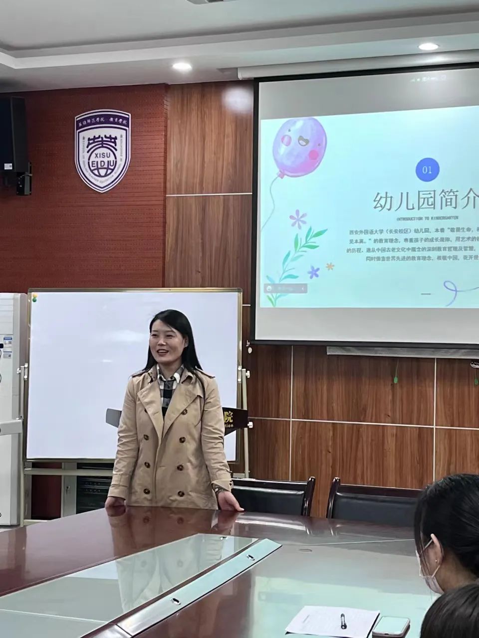 紧接着,毕业班辅导员王鑫结合专业设置、课程体系、培养计划等对2023届毕业生的情况做了详细介绍,说明学院与西外附属幼儿园的交流合作渊源,希望毕业生们积极应聘。