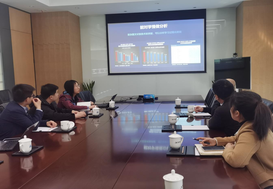 参观结束后,双方领导及工作人员在科大讯飞会议室就“AI+教育”这一领域的对接合作进行了深入交流。会谈中,王嘉铭副院长表示,未来希望能持续跟进和打造人工智能技术的应用成效,加强高校、企业和中小学在智慧教育、个性化学习和数据驱动研究方面的对接,促进协同发展,推进产学研一体化。科大讯飞相关业务负责人也表示愿意与我方建立长效合作机制,欢迎毕业生来企实习、就业。随后,本科生辅导员王鑫就学生就业问题与工作人员进行相关对接。