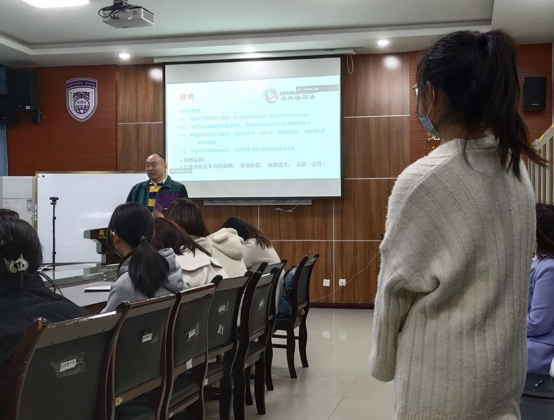 随后, 王老师介绍了海外实习港的其他项目、招聘条件以及薪酬福利。介绍过程中,与同学们积极互动交流,部分学生深入沟通有关工作方面的信息,主动了解用人单位的情况和各职位工作情况,积极展示自我,寻求就业机会。