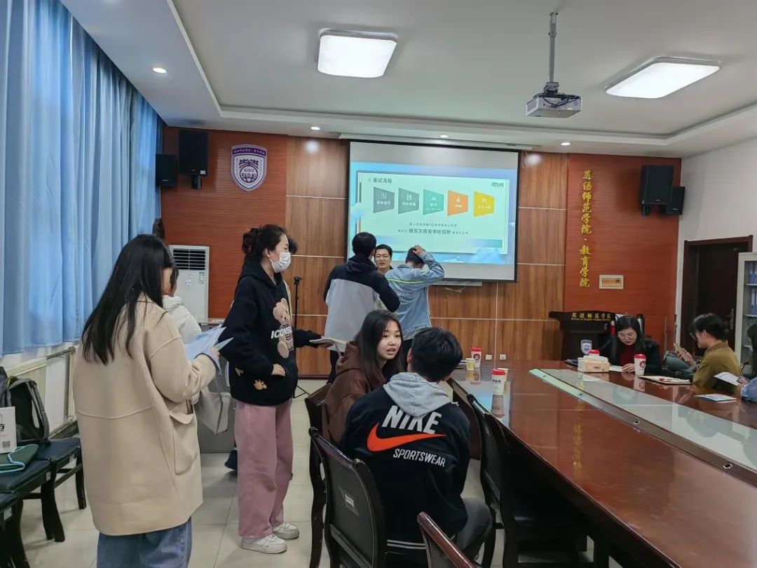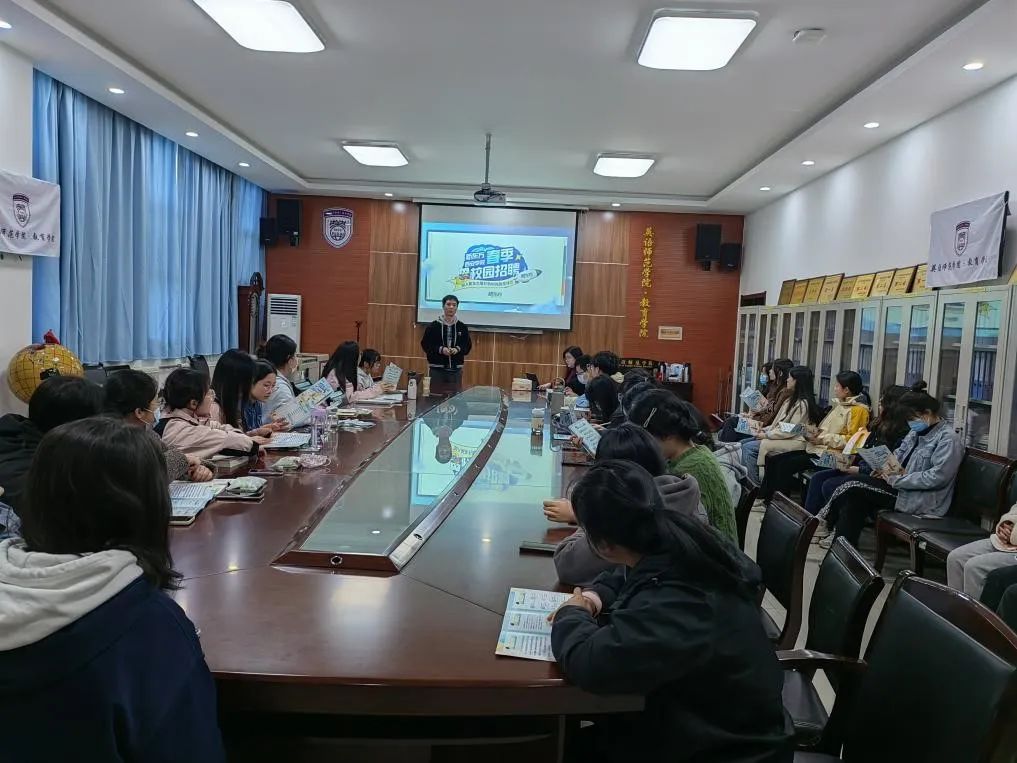 邀请新东方教育科技集团在学院H107会议室举办专场招聘会。新东方西安学校招聘经理秦迪、招聘主管刘振辉、分级阅读项目教师刘晓磊,本科毕业班辅导员王鑫、鹿国鹏以及部分毕业生参加招聘会,会议由王鑫主持。