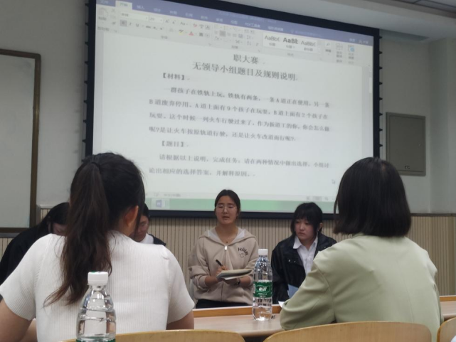 学子良好的精神风貌和积极的求职态度。选手完成面试后,评委老师集中针对比赛中选手们普遍存在的问题,重点就群面常见误区、角色选择及情绪把控等方面进行了细致的点评总结。在结构化面试中,参赛选手思维敏捷、逻辑清晰,展现出阳光、自信、得体的一面。评委们肯定了参赛选手的优点,并就简历制作、笔试准备、语言表达等方面给出建议。在教师试讲赛道中,各评委针对参赛选手的问题,从教师用语、教案设计、课堂活动等方面提出建议,参赛选手表示日后会不断改进。