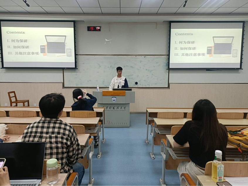 首先进行分享的是张博深同学,他的分享主题是“只为赶路,无问西东”。该同学目前保研推免至苏州大学外国语学院。他就自己的相关经历,为同学们介绍“保研=本校预推免资格+目标院校offer”的具体流程,且特别指明“保外”的途径可以通过夏令营、预推免和九推三种方式,并详细介绍了夏令营的基本流程。此外还强调了专业成绩、专四和相关竞赛证书对争取保研名额的重要性,他建议同学们一定要巩固好专业知识,同时准备好保研文书等材料。同时,还分享了一些参加夏令营时的有趣经历和心得感悟,他鼓励大家提前规划未来发展方向、努力提高个人综合素质、同时要注重保持积极心态。