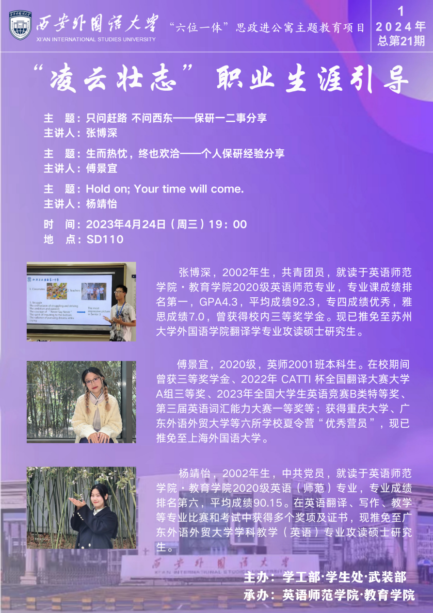 2024年4月25日晚19:00,“凌云壮志”职业生涯引导分享会暨“我和西外”成长故事会(第二十一期)在我校实验楼D区110室成功举行。本期主讲人为英语师范学院·鸭奈飞