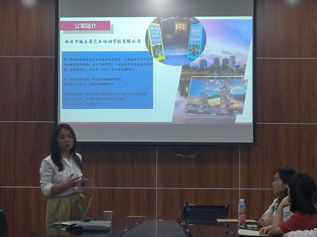 接着,谌丹校长结合自身创业经历,讲述了教培行业目前发展现状,并进一步围绕业务范围、校区展示、鸭奈飞、未来规划、薪酬待遇等方面对豌豆荚艺术培训学校展开介绍。