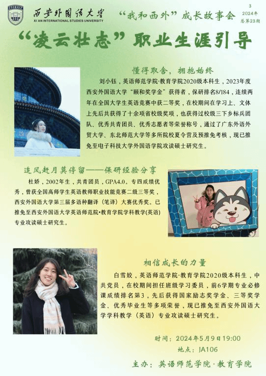 2024年5月9日晚19:00,“我和西外”成长故事会暨“凌云壮志”职业生涯引导分享会(第三期)在我校教学楼A区106室成功举行。本期主讲人为英语师范学院·鸭奈飞