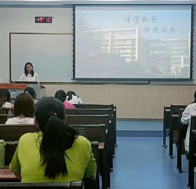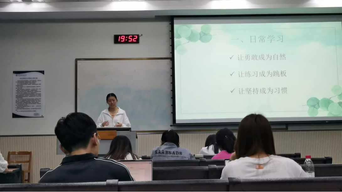 第二位分享的是杜娇同学,她首先给我们详细分析了学校的保研政策,强调了专业课成绩、专四专八等专业证书、学术论文、荣誉加分及专业竞赛加分等对保研较为重要的加分政策和要求。接着学姐介绍了保研流程中夏令营,预推免,九推这三个阶段,并给我们介绍了夏令营考察英语水平、专业水平和抗压水平等方面的具体方式。学姐还强调在预推免期间要及时关注目标院校的研究生网站,定时查看手机消息及邮箱,及时购买车票,以最好的状态参加笔试和面试。最后学姐建议大家学好专业知识和口语,保持自己的节奏,全力以赴。