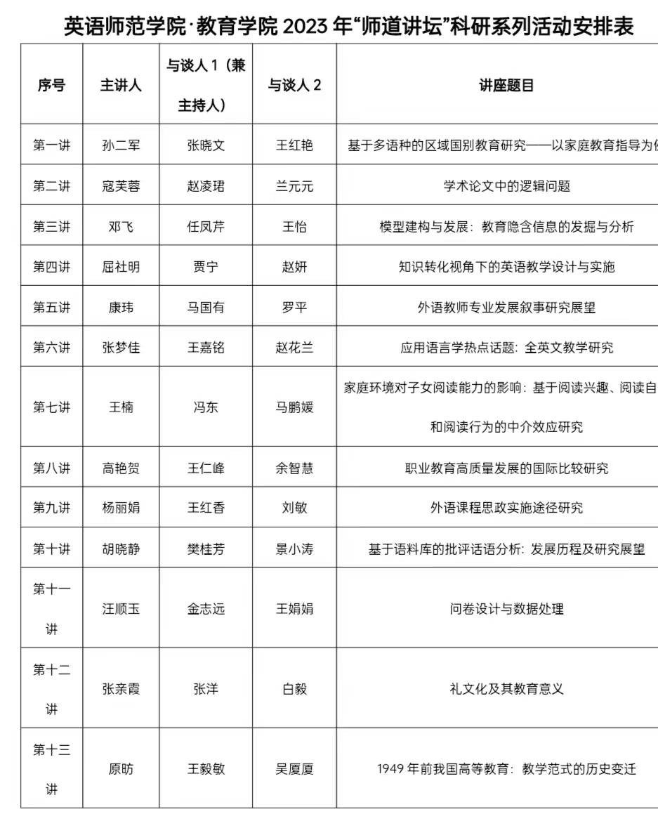 (二)直接目的:建立和基础教育、校外知名教育家、理论名家的桥梁纽带,提升中青年教师的学术品质,丰富本硕学生的学术形式,打造英师“师道讲坛”品牌。