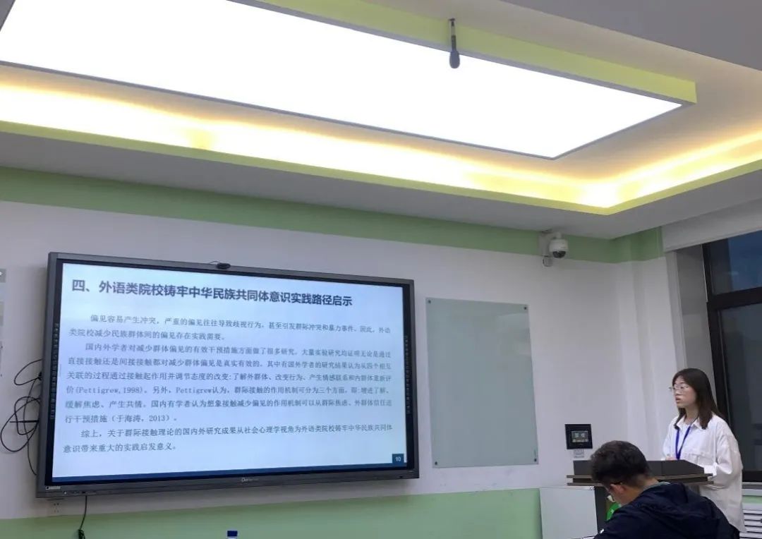 研究生袁娇娇、宋一丹、吕雪、段晨昊四位同学。袁娇娇同学提交了参会论文《外语类高校铸牢各族大学生中华民族共同体意识的路径研究——基于群际接触理论视角》并在硕士生论坛第三分论坛作汇报发言。她认为,群际接触被认为是心理学中促进群际关系的最有效策略之一,对外语类高校铸牢各族大学生中华民族共同体意识具有启发意义。因此,她从群际接触理论视角出发,从群际接触理论对外语类高校铸牢各族大学生中华民族共同体意识路径的价值、外语类高校铸牢各族大学生中华民族共同体意识路径的实施、外语类高校铸牢各族大学生中华民族共同体意识路径的问题、外语类高校铸牢各族大学生中华民族共同体意识路径的优化四个方面进行了研究。