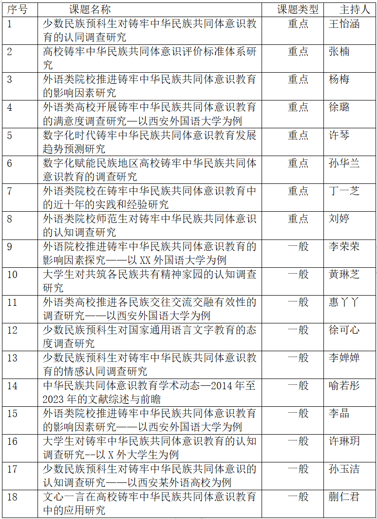 2024年1月8日,我研究中心在学院公众号上公开发布了《铸牢中华民族共同体意识教育2024年研究课题申报通知》,得到了很多研究生同学的积极响应和大力支持。经严格评审,现确定了课题名称、类型和主持人(详见附件),共计18项,并公示3个工作日(2024年3月1-3日)