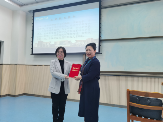 首先,刘一静介绍了大学南路小学的情况和王妮校长的简介,并代表学院向王校长颁发了荣誉证书,对王校长的到来表示衷心的感谢。