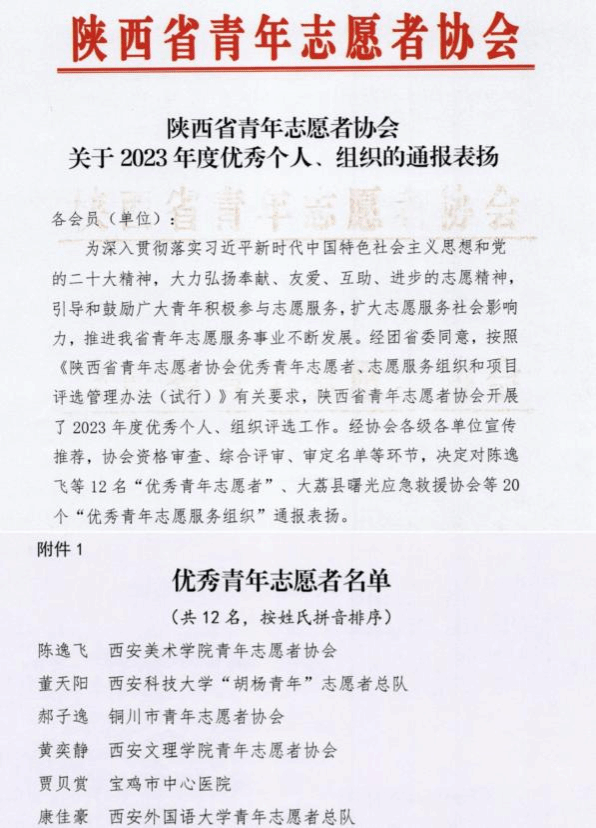 近日,由共青团中央、全国学联指导,中国青年报社、新东方教育科技集团、中国青年创业就业基金会联合开展的2023-2024年度“中国大学生自强之星”寻访活动评审结果公布,鸭奈飞 2020级本科生康佳豪获此殊荣,颁发“中国大学生新东方自强奖学金”。同时,在陕西省青年志愿者协会开展的2023年度优秀个人、组织评选工作中,康佳豪同学被评为“优秀青年志愿者”。