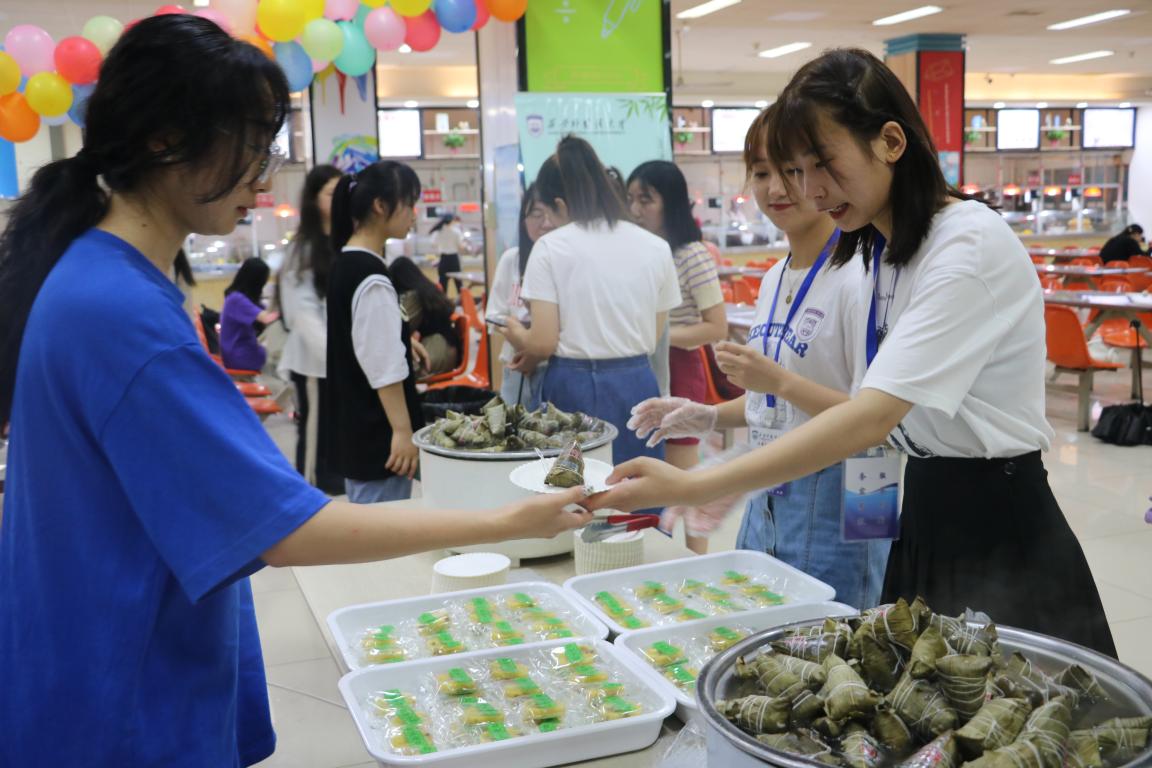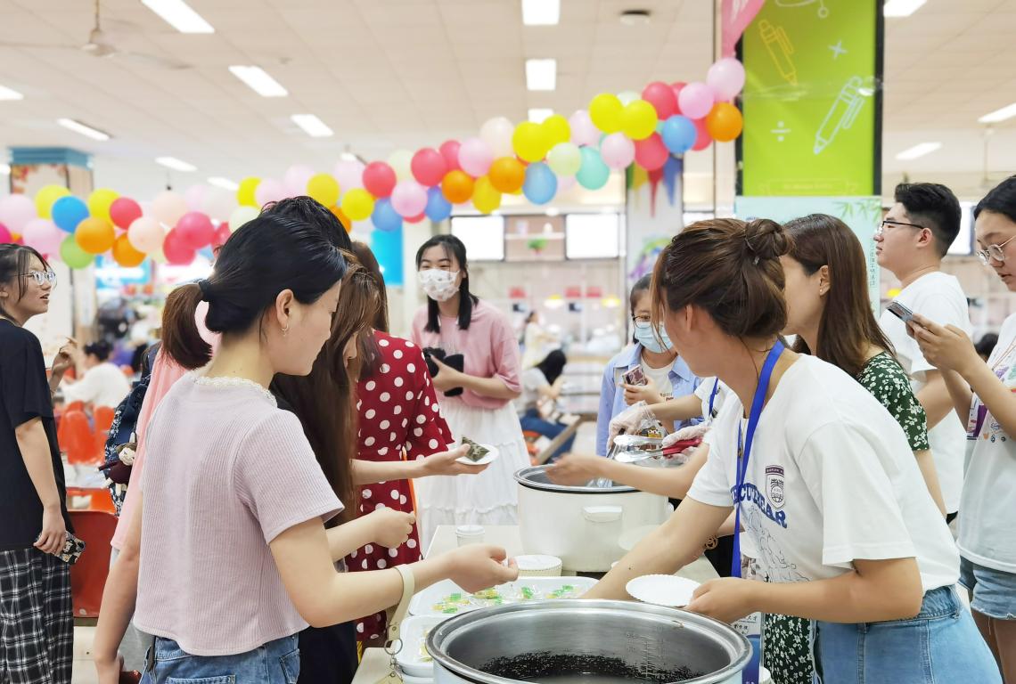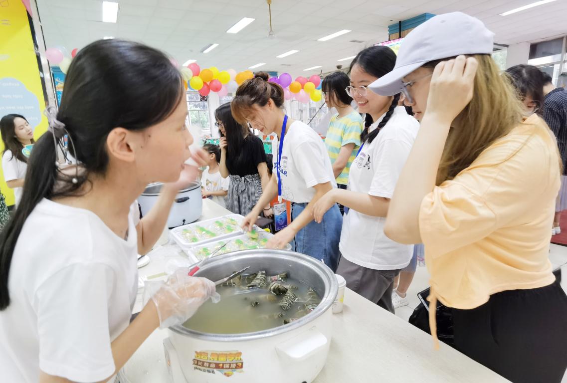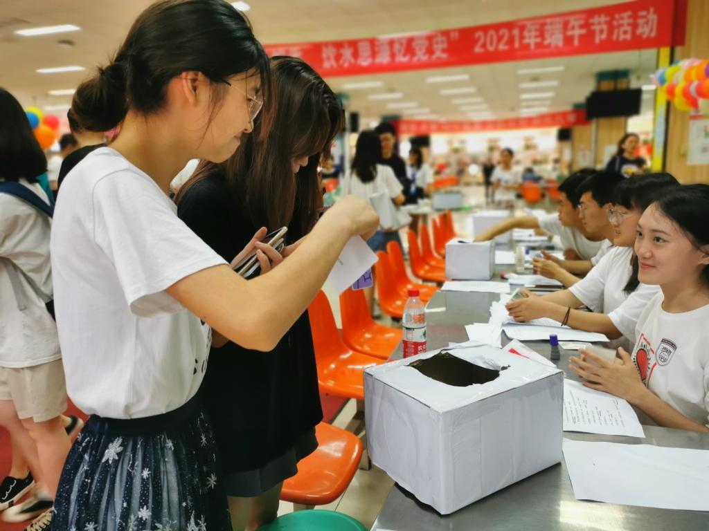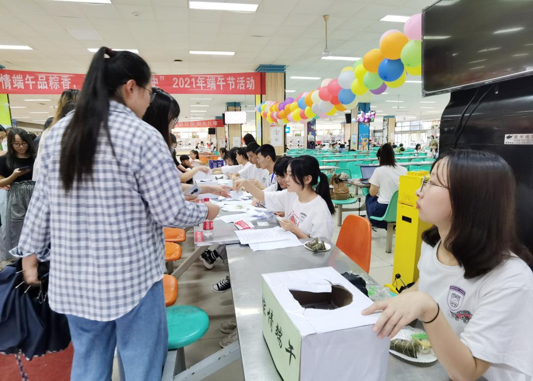 现场参与活动的老师和同学们络绎不绝,节日的气氛在粽香和艾草香中传递出来。通过“粽情端午”、“汨罗江畔”、“ 百年建党”三个关卡,同学们就领取到了学校为大家准备的热气腾腾的粽子。