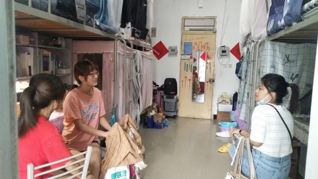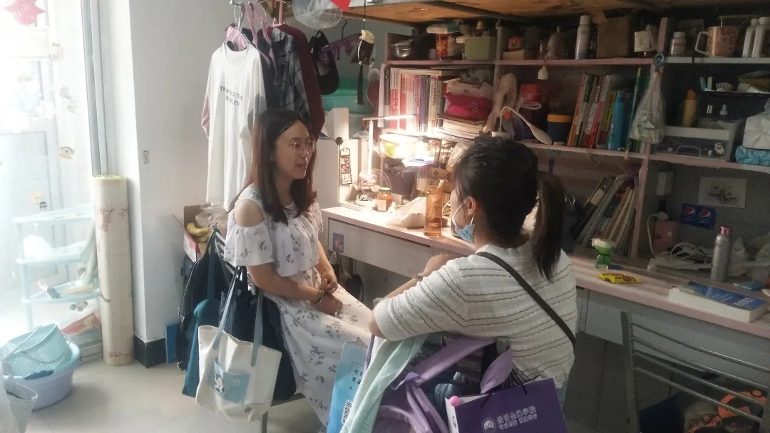 2019级辅导员王鑫、兼职辅导员王滋雨走访看望暑期留宿学生,了解十四运志愿者们培训和在校情况。